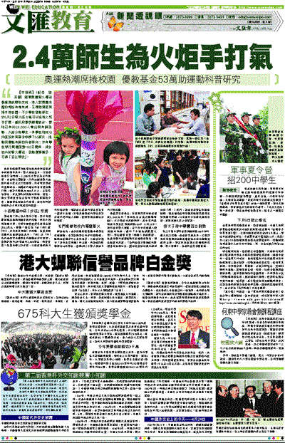 【本報訊】(記者 劉美顏)隨著奧運聖火傳送模擬測試順利完成,港人對奧運來臨的期盼有增無減,五環熱潮更席捲本港校園。不少學校發動師生,於5月2日聖火接力當日沿途為火炬手打氣。據民政事務總署統計,暫時已有約24,000人會出席有關活動,大部分為學生。有學校則成功向優質教育基金申請了53萬元,推動與運動有關的科普研究;亦有學校舉行奧運倒數100日慶典,或在校內辦聖火傳送,活動種類繁多,可謂「百花齊放」。