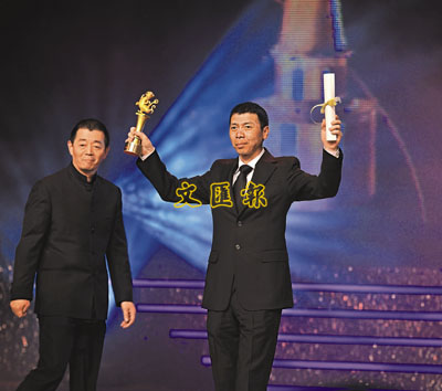 ■導演馮小剛在頒獎晚會上領取最佳導演獎獎狀、獎盃。新華社
