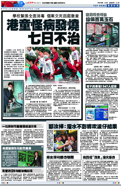【本報訊】(記者 李見安)香港流感恐慌未有減卻,一名11歲姓何男童上周出現抽搐及發燒,在威爾斯親王醫院留醫7天後,延至昨晨5時半不治。初步檢測他並非死於流感,個案會交死因裁判法庭調查。男童就讀的小學大為緊張,已暫停全校的飲水機,並全校進行消毒。至於上周因嚴重肺炎、敗血症及休克送入伊利沙伯醫院的3歲女童,情況仍危殆,而另3名留醫的病童情況亦嚴重,全部均在深切治療部接受治療。