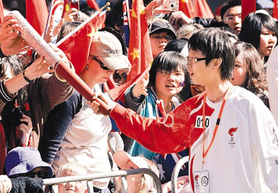 ■慶典上一名華人火炬手將火炬遞到觀眾席,分享奧運喜悅。美聯社