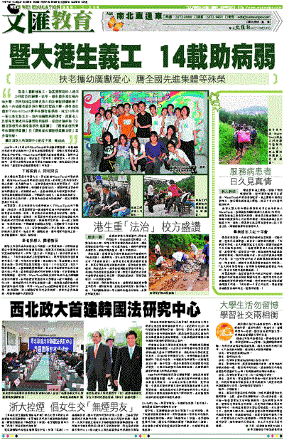 香港人喜歡做義工,為需要幫助的人提供力所能及的關懷。近年,越來越多港生到內地升學,亦同時將這份歷史悠久的社會服務傳統帶了過去。內地擁有最多海外學生的暨南大學,便有港生創辦了WarmTouch青年志願者服務隊,成立14年來一直以港生為主力,為內地麻風病康復者、孤寡老人及智障兒童提供各種幫助和服務,曾因此獲評為「全國百個優秀志願者服務先進集體」、「廣東省優秀青年志願服務集體」及「廣東省志願服務集體金獎」等多項殊榮。