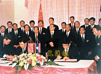 ■2000年11月,江澤民對老撾進行國事訪問,這是中國國家元首首次訪問老撾。圖為訪問期間兩國簽訂合作開發鉀鹽資源協議的情形。 資料圖片