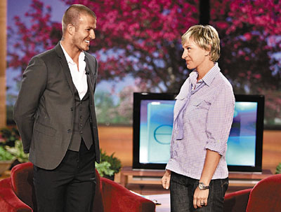 即使已踏入新一個球季,英國萬人迷碧咸仍活躍於影視節目和經常拖著囝囝現身洛杉磯的NBA籃球場,曝光率多得令人感到有點吃驚。例如在昨日播出的女同志名嘴愛倫狄珍妮絲(見圖右)清談節目裡,全身西裝上陣的碧咸予人風度翩翩感覺,還不忘本行即席表演踢球,然而能否進一步讓美國觀眾留下深刻印象,倒要看今年在銀河隊的表現了。 ■文:藝能小子/圖:美聯社