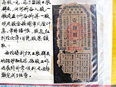 近日,一種紅色股票實物(見圖)在江西省橫峰縣一退休官員家發現。該股票實物雖經歷70多年的風雨,但原貌清晰可見。票面呈長條形,長20厘米,寬7.5厘米,印有「閩浙贛省蘇維埃銀行」及「壹圓股票」面值字樣,加蓋有銀行的紅色印章。同時,附每年領取股息和紅利的憑證,即通常所說的息票,息票每年1張,從1933年起算,共附10張。按當時的規定,該股票每股1元,也可折穀入股,每50斤穀折算1股。 ■本報駐江西記者 朱瑩瑩、危立方、金鵬