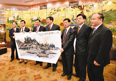 ■廈門市委書記何立峰(左四)贈江丙坤國畫《海上花園春色好》。 米南 攝