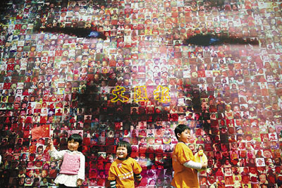 26日,3名小朋友在南京玄武湖畔由2008張兒童照片組成的「奧運寶寶笑臉」前留影。 新華社