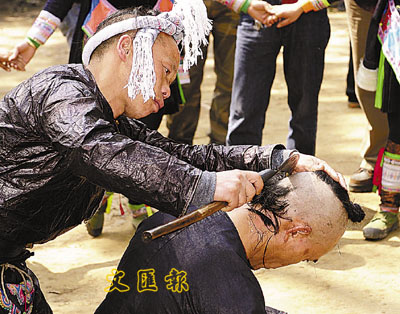 26日,貴州沙苗寨一位苗族男子為中國國際廣播電台的來賓演示用鐮刀剃頭的絕技。 新華社