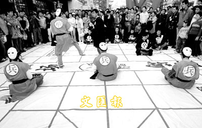26日,北京王府井大街,一些學生在巨大的棋盤上表演「人體象棋」行為藝術。他們用象棋的形式、場景、規則表現社會的就業競爭壓力。「過招」環節將太極拳、蒙古摔跤、散打搏擊等武術、體育手段悉數用上。 中新社