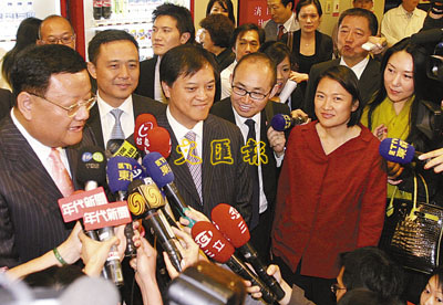 ■大陸房地產業者赴台考察備受台灣媒體關注。圖為劉長樂接受傳媒訪問。中央社