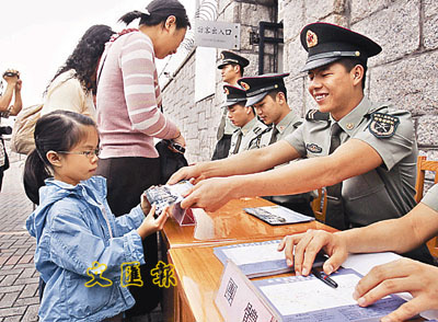 ■姓高的小朋友昨日從解放軍叔叔手中領取門票後,非常高興。 本報記者劉國權 攝