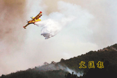 ■滅火飛機向戈梅拉島火災區灑水。法新社