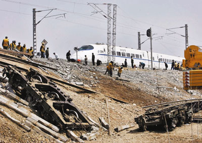 今天凌晨2時16分,總重1185噸的57006次貨車平穩通過「4.28」事故路段,中斷了20多個小時的膠濟鐵路正式恢復通車。而此時,由於原有供電設施被撞毀,搶修人員要在路基旁挖掘多個深坑,架起供電線路。