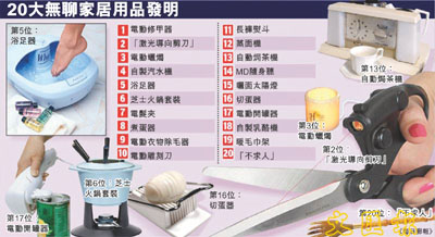 第2位則是聲稱可「剪出完美直線」的「激光導向剪刀」,不過由於激光瞄準器附在刀柄上,一但用家手震,射出的激光線亦會有所偏差。曾流行一時的浴足器則位列第5。