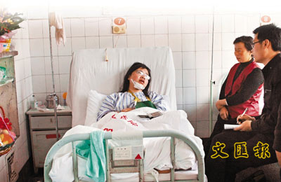 ■鐵道部和當地民政部門尚未對在「4.28」事故的傷者賠償制訂具體標準。圖為在事故中受傷的濰坊市張小姐在淄博周村醫院病房。中通社