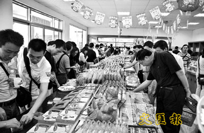 ■據一民調結果顯示,有7成台灣民眾贊成開放大陸觀光客到台遊覽,促進寶島經濟。圖為一個大陸出版界參訪團在花蓮的商店中選購台灣鳳梨酥、米麻糬等特色食品。 資料圖片