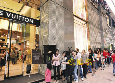 雖然內地今年開始縮短五一黃金周假期,仍不減內地旅客來港消費意慾。本港多個大型商場昨人頭湧湧,不少名店也擠滿客人,名店門外更大排長龍,每人都大包小包,場面非常熱鬧。來自武漢的徐先生表示,香港出售的名牌比內地便宜,再加上人民幣升值,在香港購物更加「折上折」。「在內地買名牌手錶要近5萬人民幣,但香港售價約等於3萬人民幣,有約30%的折扣。」