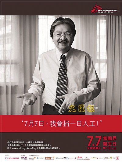 由今日開始,市民將會在港鐵月台或巴士站,看到財政司司長曾俊華做出「7.7」手勢的廣告海報,這並非政府新一輪宣傳廣告,而是鬍鬚曾義務為「無國界醫生日」拍攝的宣傳海報。事緣一年一度的「無國界醫生日」將於7月7日舉行,而今年口號為「全城做義工、捐1日人工」,希望全港市民一同參與,鬍鬚曾亦應邀擔任「無國界醫生日2008」榮譽行動大使,呼籲全港市民捐出相等於一天的收入,等同為無國界醫生擔當一天義工,以支持前線救援工作,為世界各地有需要的人民救急解困。
