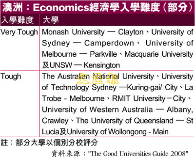 如同學選擇到澳洲升學,可參考坊間較著名的澳洲大學排名書籍"The Good Universities Guide"。根據"The Good Universities Guide 2008",以經濟學的入學要求程度來說(請參考下表),共有5所大學包括: Monash University、University of Sydney、University of Melbourne、Macquarie University及UNSW獲評為入學難度最高 "Very Tough"的大學。在以上所提及的5所大學中,相信大家對當中4所被喻為澳洲「八大」的Monash University、University of Sydney、University of Melbourne和UNSW不會感到陌生,因為她們也是大家耳熟能詳的知名澳洲大學。但是大家不能小看Macquarie University這所位於澳洲悉尼市郊North Ryde的著名大學。Macquarie University是一所生氣勃勃、追求進步與創新的頂尖大學,一直以其傑出的學術成就及高質量的研究成果而著名。Macquarie University在多方面均受到高度評價,其中最為突出的學科可說是商業科目,包括今期所介紹的經濟學。其經濟學學士學位 (Bachelor of Economics)課程為期3年,主要教授有關產品、服務及資產的生產、分配和使用,以了解及探究個人/商業及政府如何作出經濟學上的決定。而最值得同學們注意的是,雖然Macquarie University的經濟學非常著名,但其最低入學要求並不算高,只須高級程度會考約6分 (即約DDD)和英語達IELTS 6.5分或以上。