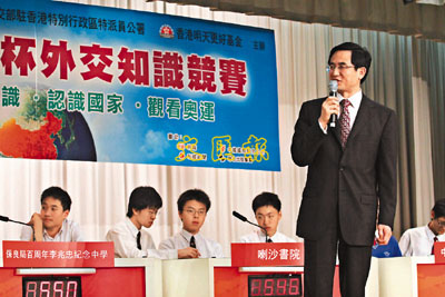 身為準決賽主席評判的外交部駐港公署副特派員楊子剛,對推廣外交知識不遺餘力,他除為比賽任評分外,也深入淺出地分析學生的表現,點評各隊代表在情景模擬時的強弱項。他又特別與參與者分享了愛國、學識淵博及掌握交流藝術3項當外交官的條件,更對學生寄以厚望,希望中國外交「後繼有人」。