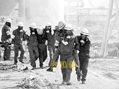 5日,安徽淮北舉行粗苯泄漏著火特大安全生產事故應急救援演練。圖為救援人員在演練中搶救「中毒」人員。 新華社