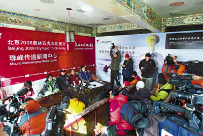 ■珠峰大本營絨布新聞中心6日公布奧運火炬接力珠峰傳遞發山隊員的名單。當日,中外媒體早早來到發布會現場,搶佔有利拍攝位置。本報記者孫戉 攝