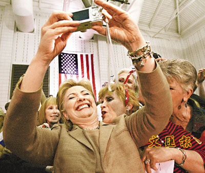 ■希拉莉前日在北卡州拉票,與支持者合照時十分興奮。美聯社