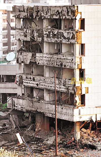 ■1999年5月7日,中國駐南斯拉夫大使館被襲。以美國為首的北約悍然使用3枚導彈襲擊了中國駐南聯盟大使館,造成嚴重傷亡。圖為使館建築一側牆壁被導彈全部炸毀。資料圖片
