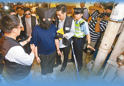 ■涉嫌殺害失蹤少女王嘉梅的男子,蒙頭被警方押返石硤尾街市重組案情。本報記者溫瑞麟 攝