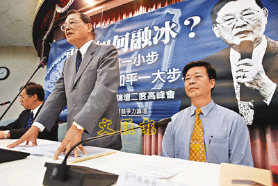 ■江丙坤(中)8日上午坦承,7月4日要完成「周末包機」的確很趕,到晚上則澄清,指仍以7月4日為目標,完成周末包機。中央社