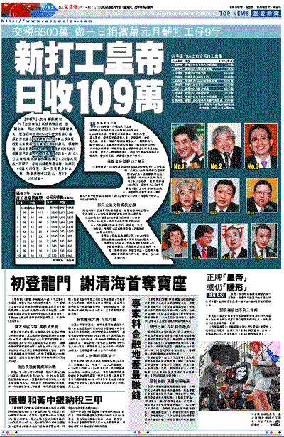 稅務局昨日公布07/08年度,本港10大打工皇帝所繳交的薪俸稅款,分別由2,600萬元至6,500萬元不等,整體較前年度增加。稅務局發言人表示:薪俸稅的應評稅入息,除薪金外,亦包括花紅、佣金、津貼和認購股權等收入。個別納稅人繳交的稅款,不能反映整體稅收情況。個別薪俸稅納稅人的稅款特別高,可能與他們收到基本薪金以外的其他收入有關。換言之,因為經濟暢旺,10位打工皇帝不僅薪金水漲船高,獲分的花紅、佣金等亦更加「和味」。