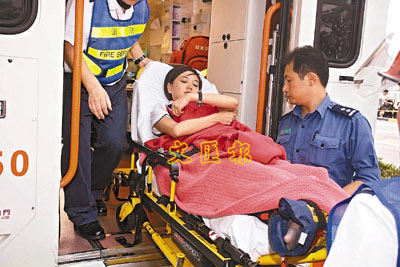 ■東方航空一架客機在上海抵港途中遇上氣流多人受傷。圖為其中一名空中女服務員送院。