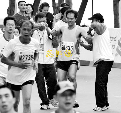 ■運動過量,除可致肢體受傷外,原來亦令身體抵禦疾病感染的能力下降。圖為馬拉松選手體力不支需旁人扶持。 資料圖片