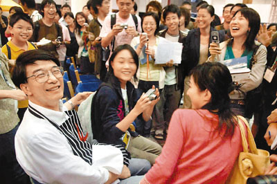 ■科大15周年校慶,朱經武(左)與學生共聚一堂,談笑甚歡。資料圖片