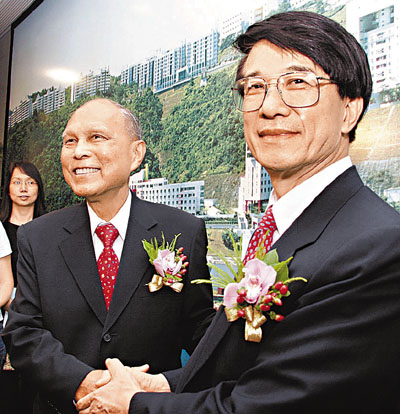 ■05年科大獲霍英東(左)捐款8億元,當時朱經武(右)大為感動。 資料圖片