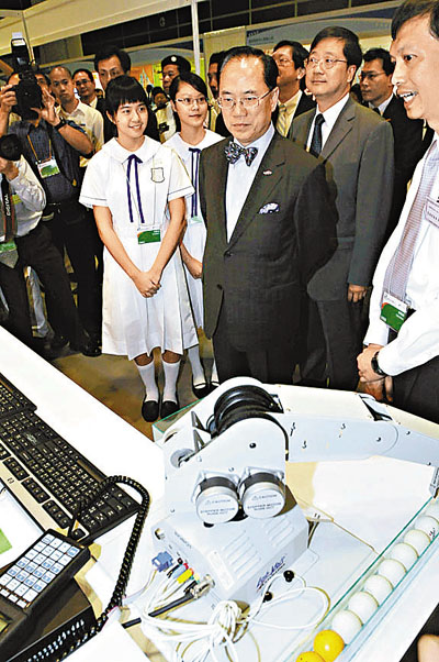 ■曾蔭權參觀優質教育基金計劃匯展攤位,了解本港教育的最新發展。 本報記者高仲明 攝