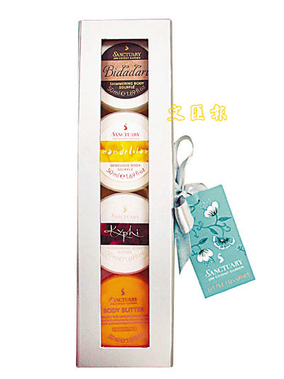 為配合母親節的來臨,Sanctuary推出限量版禮物盒(圖),4小盒不同質感的潤膚系列,部份未曾在香港出售,當中深層滋潤身體潤膚霜及閃爍身體潤膚乳是瑰麗特別版,其獨有成分令肌膚更滋潤光采,閃爍身體潤膚乳更蘊含微細金粉,塗後令肌膚閃閃發光。