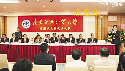 【本報訊】(記者 沈清麗)廣東外語外貿大學香港校友會成立慶典,昨日在灣仔華潤大廈會議廳隆重舉行。廣東省政協副主席兼大學校董會主席湯炳權、全國政協常委范徐麗泰、行政會議召集人梁振英、外交部駐港副特派員詹永新、中聯辦教科部副部長莫錦華、廣東外語外貿大學校長徐真華等政界和學術界首長,與首屆香港校友會會長何建立,及逾500名會員和校友,共同舉杯慶賀,場面熱鬧。