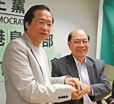 ■黎志強(右)被民主黨港島區支部否決率另一張名單出選,顯示該黨再次變相扼殺第二梯隊出頭的機會。黎旁邊為甘乃威。本報記者攝