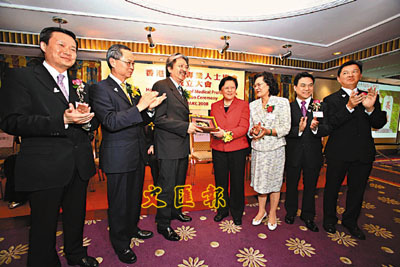 ■范徐麗泰總監、霍泰輝榮譽總監、楊志紅監事長、王賜豪、郭寶賢會長、江明熙主席致送紀念品予主禮嘉賓曾俊華司長。