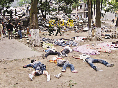 ■北川一所倒塌了的學校旁邊,擺滿死難者的屍體。 路透社