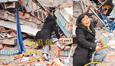 ■13日,四川綿竹市漢旺鎮一所倒塌的中學廢墟中,一位母親發現她受重傷的兒子。她一邊安慰兒子,一邊哭著呼救。 新華社