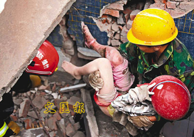 ■救護人員在四川綿竹市漢旺鎮武都小學抬出一名被瓦礫活埋的學生。 新華社