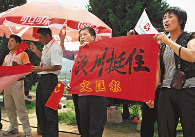 13日,奧運火炬在福建龍岩傳遞,有圍觀的市民手持標語聲援汶川災民。 中新社