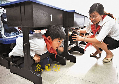 13日,重慶市一間小學老師教導學生們在地震時如何避險自救。 新華社