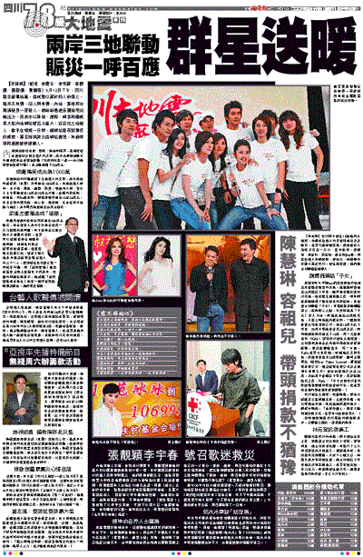【本報訊】(記者 李慶全、李思穎、梁靜儀、植毅儀、黃國強)5月12日下午,四川發生嚴重地震,造成數以萬計的人命傷亡,雖然天無情,但人間有情,內地、香港和台灣演藝界一眾藝人,都紛紛透過各種途徑出錢出力,而其中以新浪、搜狐、網易和騰訊等大型內地網站號召力最大,近百位三地藝人、歌手在短短一日間,經網站發表對事件的感想,甚至將捐款交由網站處理,無論效率和速度都快得驚人。