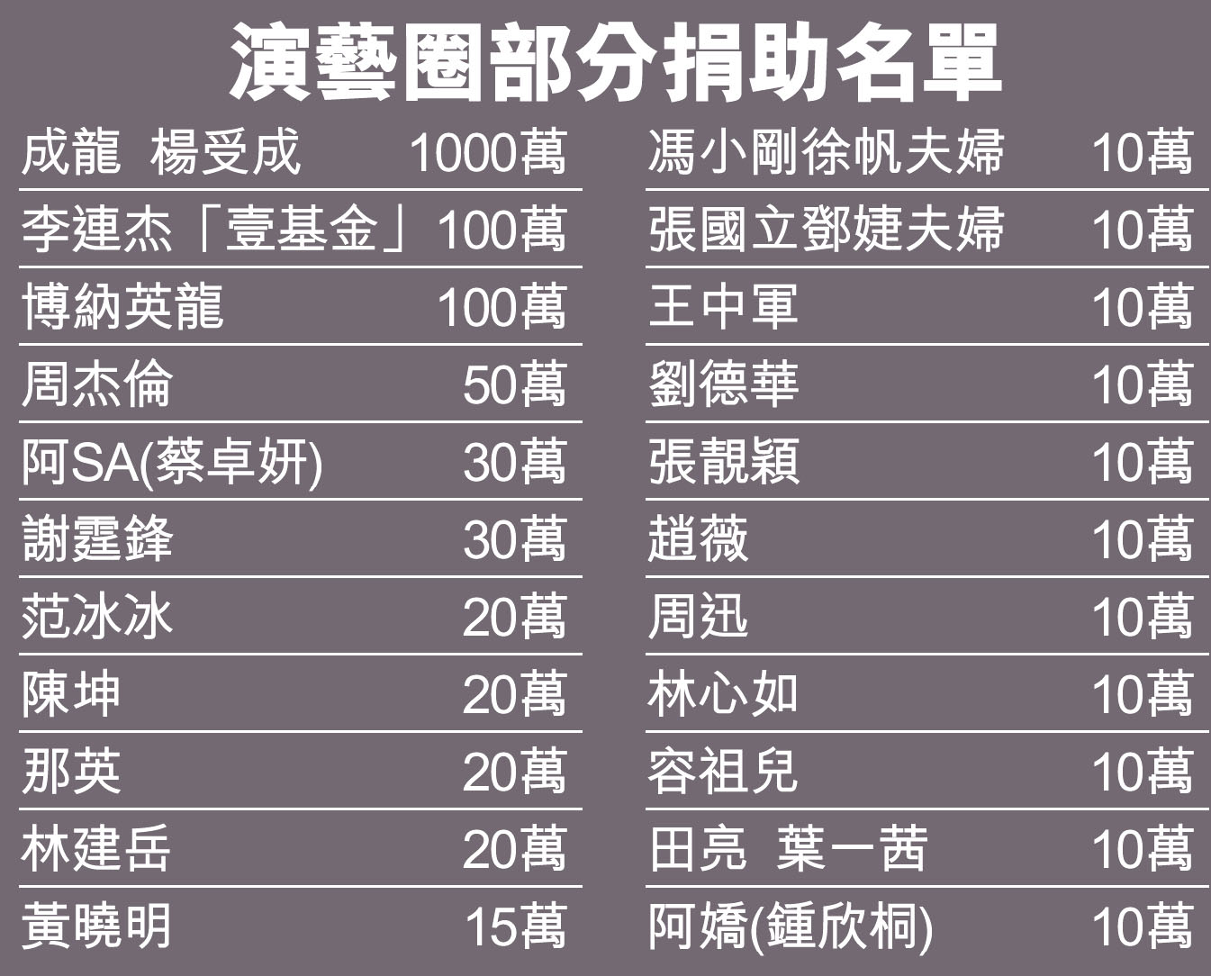 演藝圈部分捐助名單