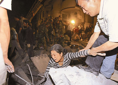 ■13日,救援人員在四川都江堰市聚源鎮聚源中學救出一名女生還者。 路透社