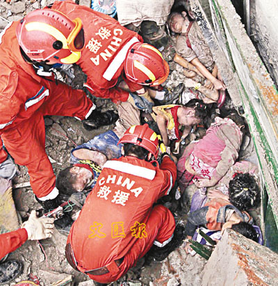 ■四川都江堰市一間中學在地震中倒塌,眾多師生被埋。圖為救援人員將一名剛剛從廢墟中找到的遇難學生遺體抬離現場。 路透社