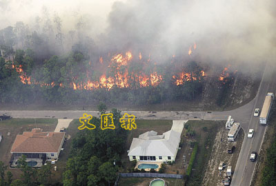 ■佛州山火疑為有人縱火導致。圖為火舌逼近民宅。 美聯社