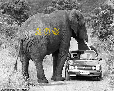 遊客到南非的野生動物園都想近距離觀看動物,但牠們的反應有時候卻是我們意料之外的。瑞士兩名遊客貝爾特拉梅及安杰拉早前在南非赫盧赫盧偉一個野生動物園遊玩,其間看見一隻重6噸的大象隆隆地向他們的車子走過來,並用象鼻重重的壓至車頂微微凹陷,他們都害怕車子將成廢鐵。